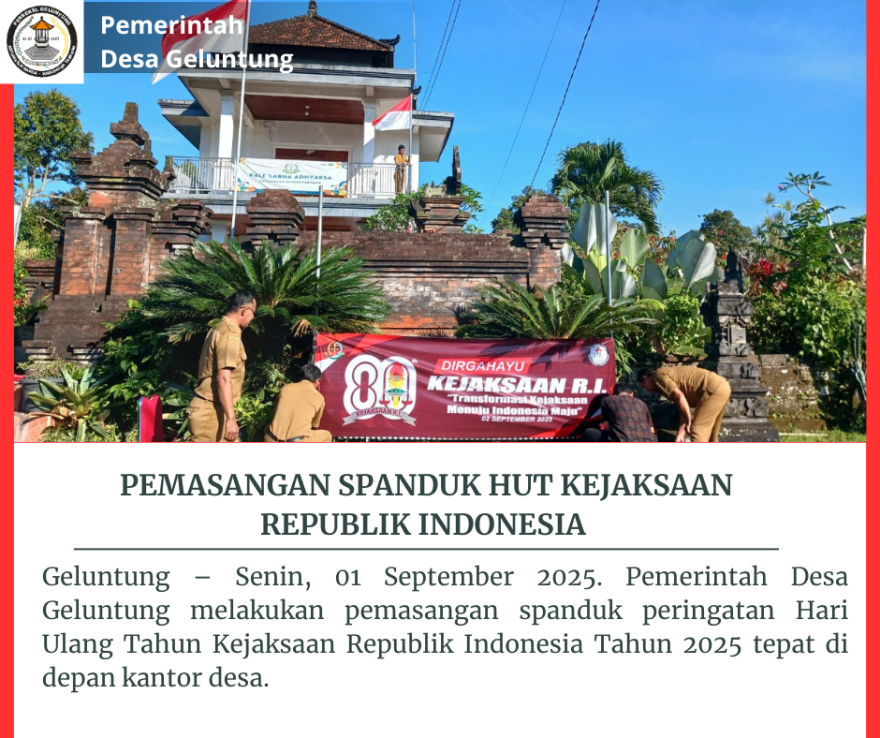Geluntung – Senin, 01 September 2025. Pemerintah Desa Geluntung melakukan pemasangan spanduk peringatan Hari Ulang Tahun Kejaksaan Republik Indonesia Tahun 2025 tepat di depan kantor desa. Kegiatan ini dipercaya mampu membangun semangat kebangsaan dan menunjukkan dukungan masyarakat terhadap peran penting penegakan hukum dalam menjaga keadilan di tingkat desa.